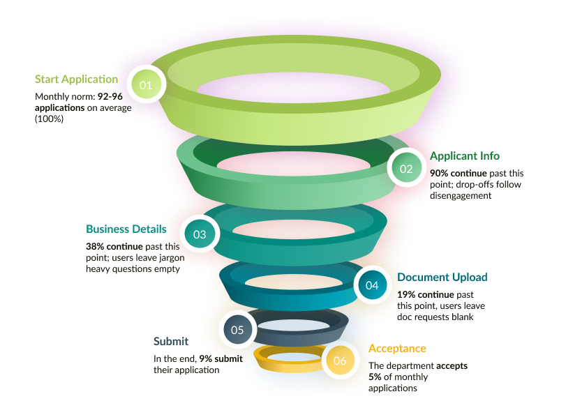 During the tests, users expressed confusion over specific instructions. They struggled with understanding terms like "gross receipts" and what documents were needed. Instructions were not user-friendly and not findable during the application. This confusion contributed significantly to the high drop-off rate.