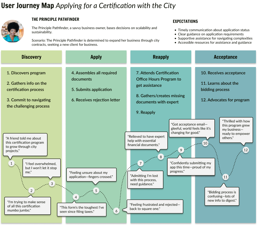 I found two personas during research: the Principle Pathfinder (someone who owns the business) and the Strategic Liaison (someone who helps the owner apply). These interviews helped my team understand user needs, such as what kind of device they use.